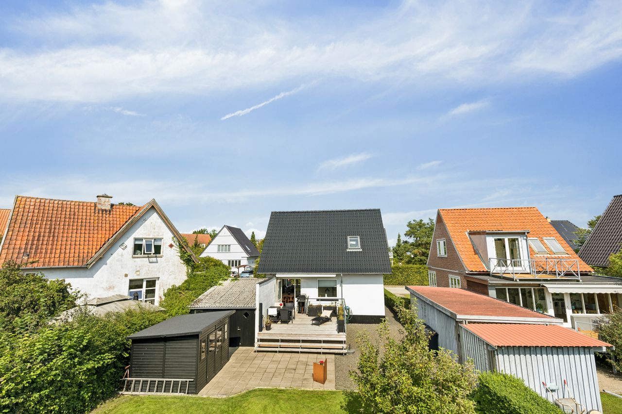 Boligens stue og køkken ligger i delvis åben forbindelse, hvilket indbyder til både hverdag og fest. Opholdsrummene er placeret i stueplan med udgang til en skøn træterrasse, der med sit sydlige fokus garanterer sol det meste af dagen – altså når solen skinner.