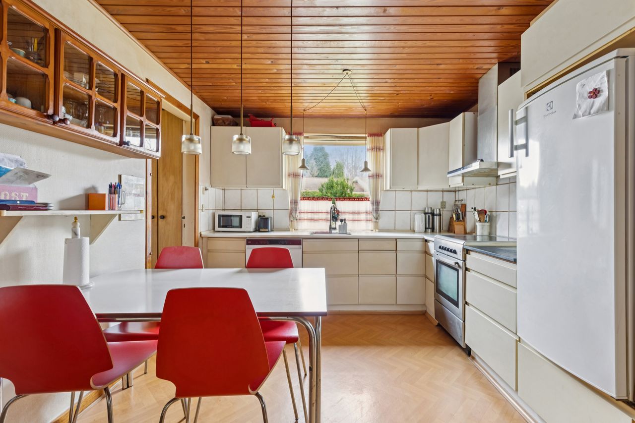 Køkkenet er placeret ved siden af er et nydeligt rum med spiseplads til hverdagens måltider. Herfra er der videre adgang til et rummeligt bryggers.